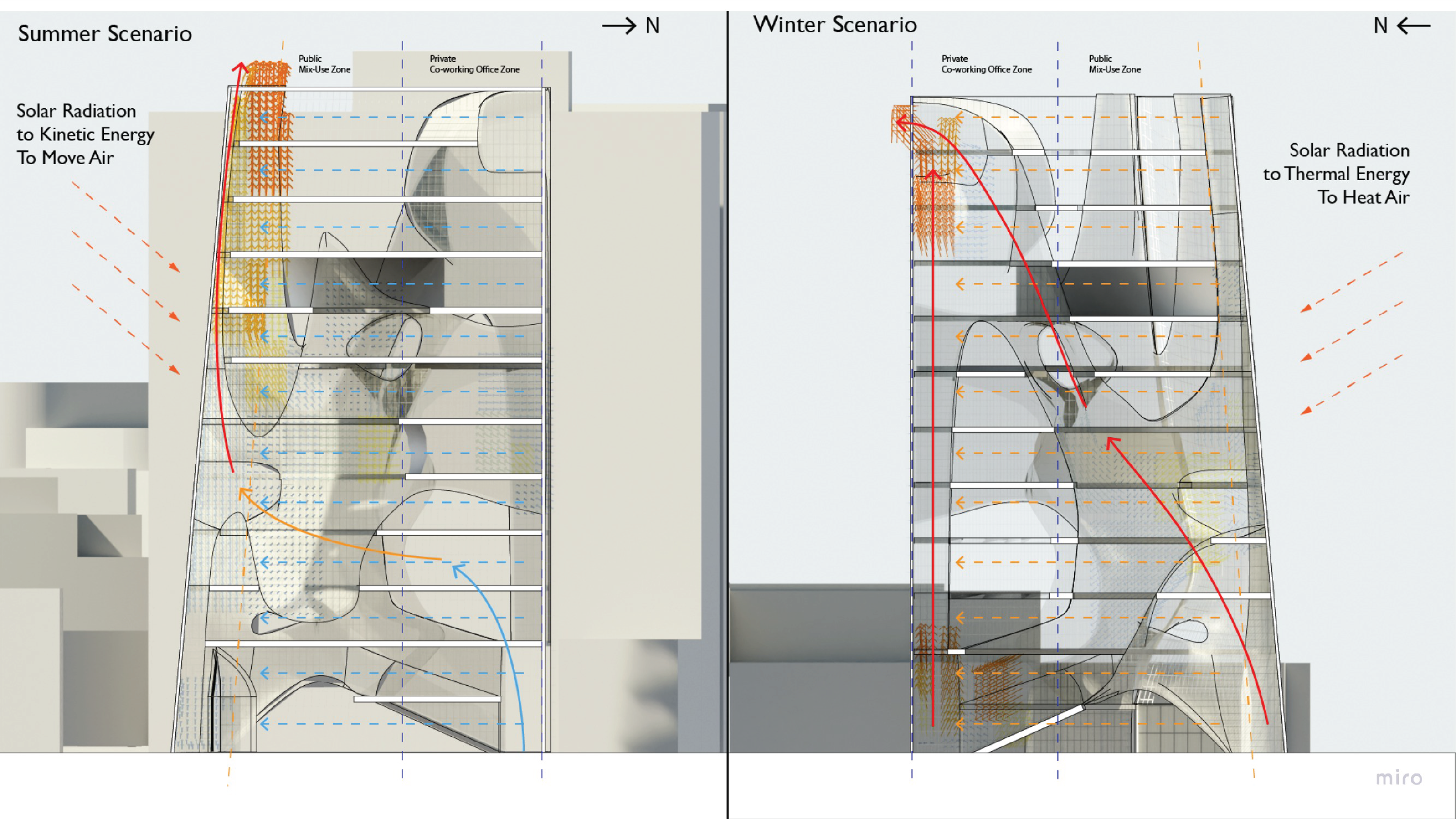 The project adds a new layer of transparency to mid and high-rise buildings: Air, to blur the distinction between the interior and exterior. Instead of using MEP to circulate air, solar energy is collected from the glass panels on the south side atrium (solar trap) to drive the air through the building.